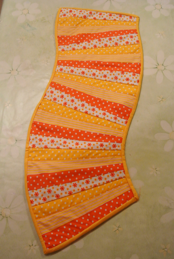 Entstanden ist ein sommerlicher Tischläufer in gelb und Orange, der höchstwahrscheinlich nur der Erste gewesen ist. Er ist schnell zugeschnitten und noch viel schneller zusammen genäht. Also genau nach meinen Geschmack. Nur das Binding (die Umrandung) hat ein wenig länger gedauert, da ich sie auf der Rückseite mit der Hand angenäht habe.